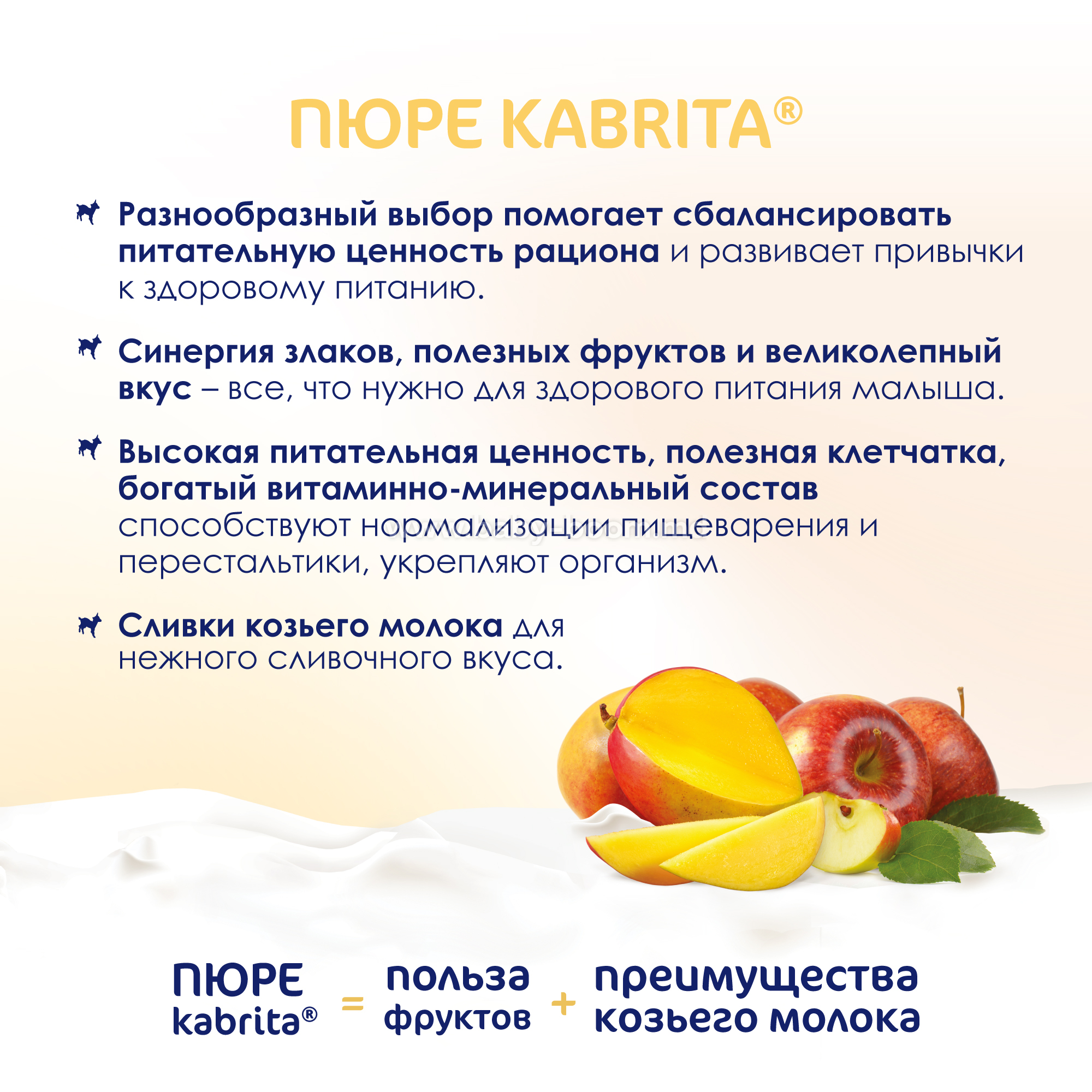 Изысканный и вкусный десерт Kabrita® из спелого манго и сладких яблок в сочетании с нежными сливками козьего молока. Натуральное фруктовое пюре обладает мягким вкусом, легко усваивается и подходит для малышей с 6 месяцев.