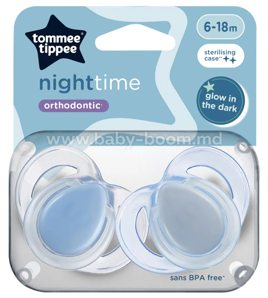 Tommee Tippee TT0474 Пустышка симметричная "Night Time" голубой (6-18 м.) 2 шт.