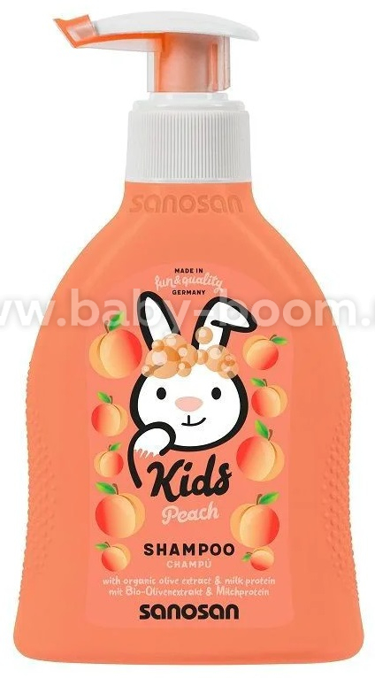 Шампунь для детей Sanosan Kids с ароматом персика— то, что нужно, когда веселье так же важно, как качество! Его любят и дети, и мамы. Детям нравится симпатичный зайка Сани и душистый аромат персика. А мамам — полезный состав.
