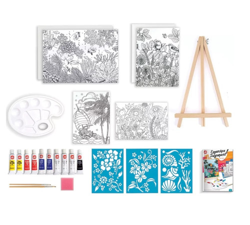 В набор входят:1 палитра, 10 акриловых цветов, 1 губка, 3 трафарета, 2 холста для живописи (27х20 см.), 2 кисти, 1 деревянный мольберт (20х36 см.), 4 картона 2х размеров, 1 инструкция по эксплуатации.
