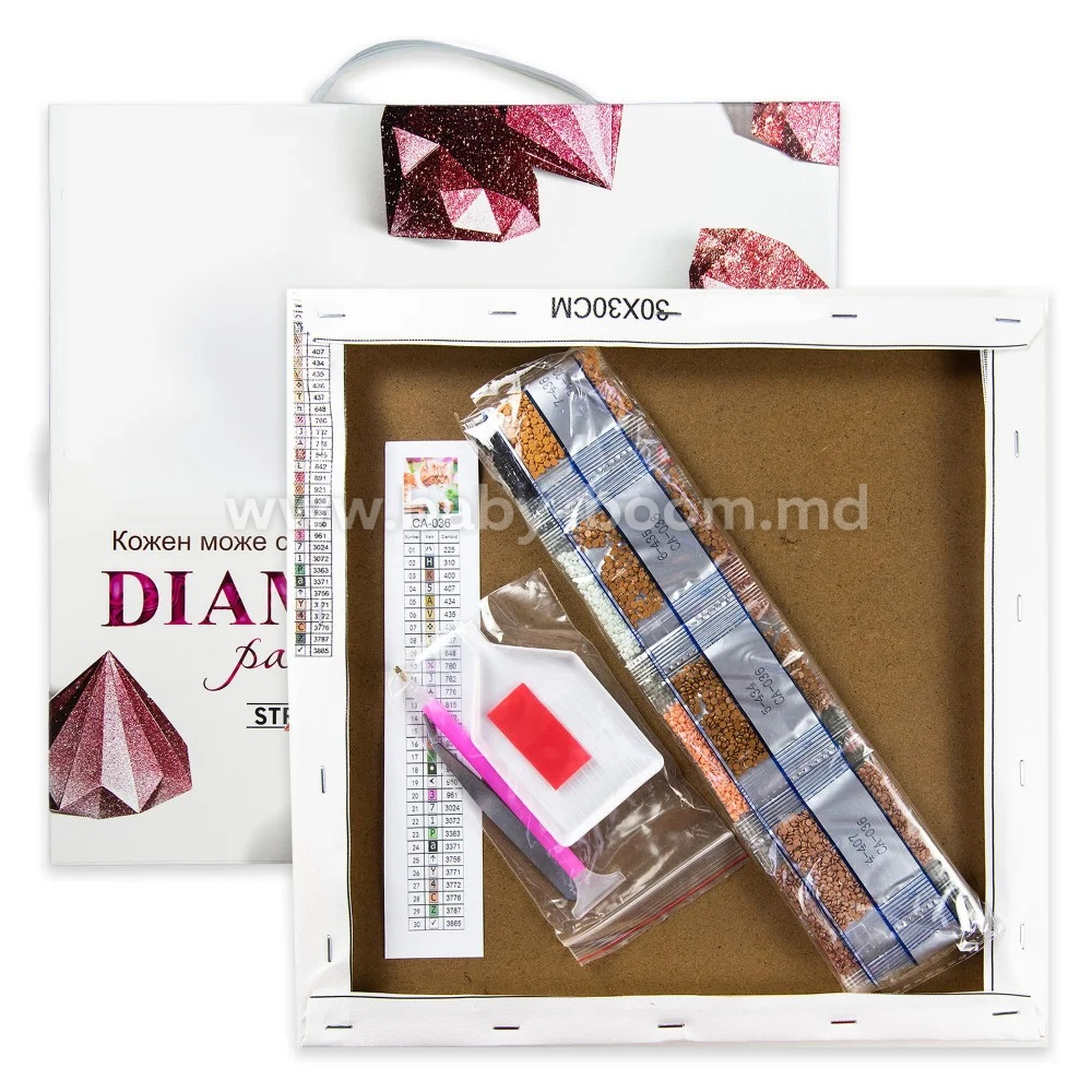 Комплектация:  холст с клеевым слоем на подрамнике,  лоток для сортировки страз, пинцет, стилус, липкая масса для стилуса,