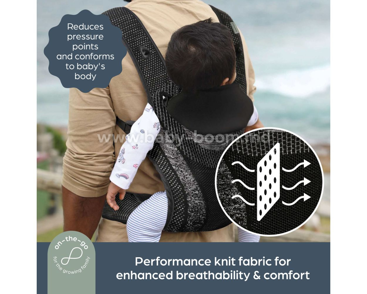 Инновационная легкая дышащая трикотажная ткань, из которой изготовлена переноска Inspire, покрывает всю поверхность, обеспечивая максимальную циркуляцию воздуха во всех положениях, а также является легкой и удобной в ношении. Изготовленная из дышащей трикотажной ткани со стильной текстурой, она гарантирует, что и вы, и ваш малыш будете чувствовать себя прохладно и уютно.