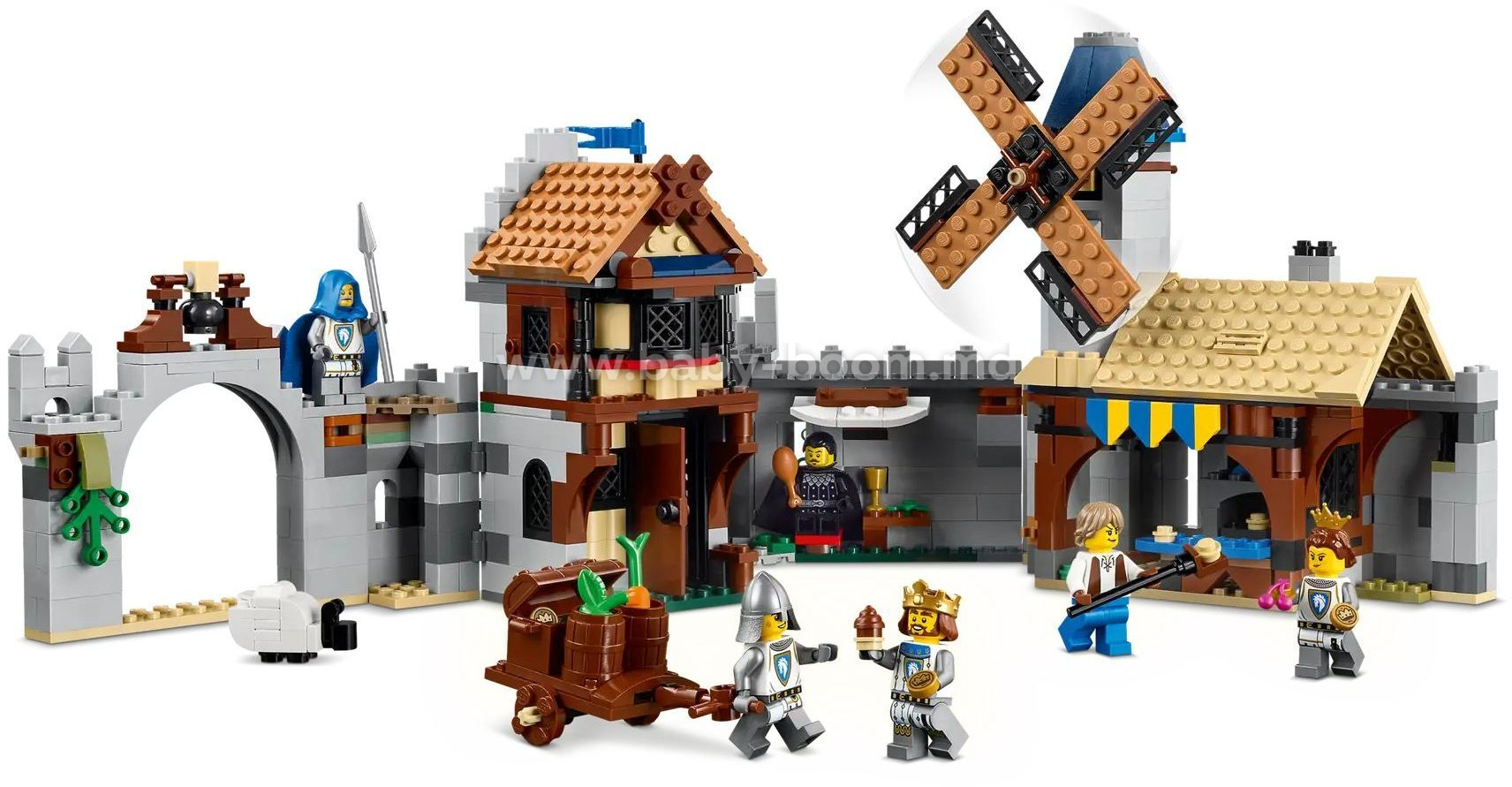 Мальчикам и девочкам от 9 лет и старше предлагается 3 варианта сборки: интерактивный замок, рыцарская арена с небольшим замком или средневековый город с мельницей. В каждый набор входят 6 минифигурок: рыцарь-король, рыцарь-чемпион, рыцарь-лучник, рыцарь-копейщик, кузнец и рыцарь-змея, а также 2 подвижные лошади.