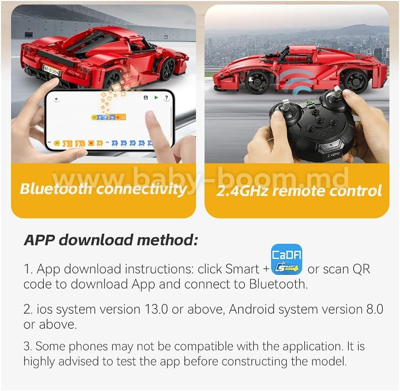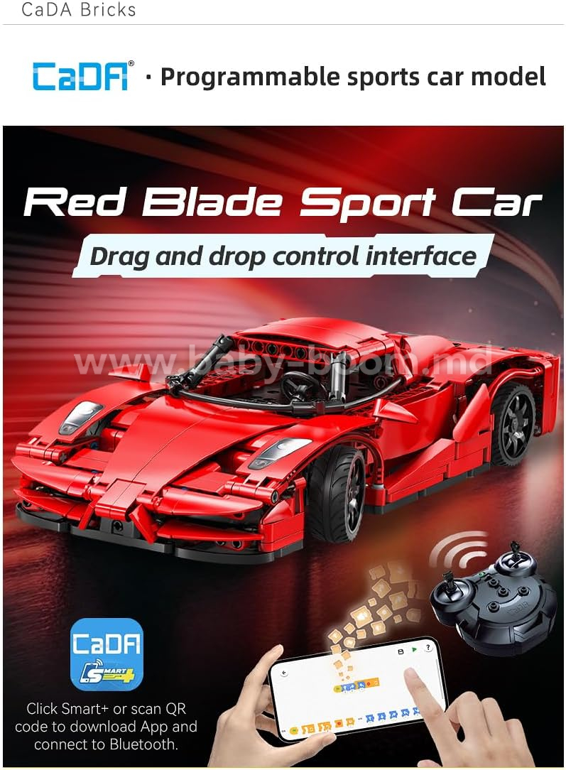 Несколько режимов управления со смартфона: дистанционное управление, режим гироскопа, режим пути по линии и программирование маршрута. Программирование на языке подобному Scratch* в официальном приложении CaDA.(Скретч — язык программирования, созданный для детей и подростков.) Дальность действия пульта около 25 метров.