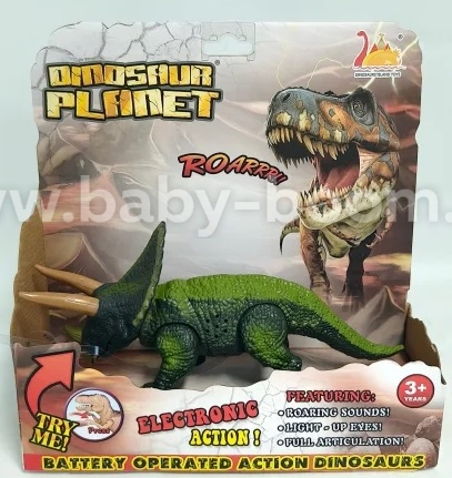 Игрушка Трицератопс — это электронная фигурка динозавра, которая издает звуки, имеет светящиеся глаза и полностью подвижные конечности.