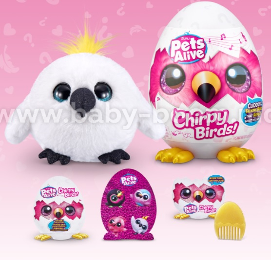 Познакомьтесь с самыми щебечущими птичками на свете! Этим супермягким и плюшевым птичкам всегда есть о чем поболтать! Поговорите со своим новым щебечущим другом, и что бы вы ни сказали, он за вами все повторит! А еще они пропоют вам свои любимые мелодии! Внутри яйца находится 5 сюрпризов, так что скорее отправляйтесь на встречу со своим новым другом!