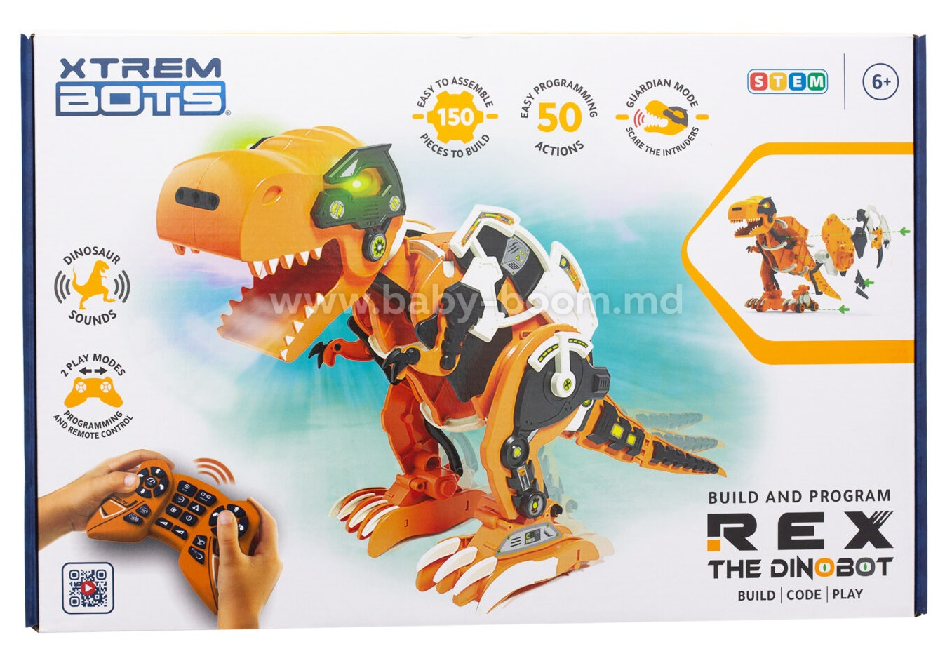 Соберите и запрограммируйте своего тиранозавра Рекса, забавного робота-динобота! Войдите в мир конструирования, машиностроения и программирования с Диноботом. Стройте, программируйте и играйте в простой и увлекательный способ. Оживите Рекса, собрав 80 деталей. Вам также предстоит собрать его пульт дистанционного управления, с помощью которого вы сможете программировать его или управлять им с помощью системы радиоуправления. Он имеет более 50 программируемых действий и более 20 функций для бесконечных часов веселья. Рекс-Динобот станет хранителем вашей комнаты. Активируйте его режим "Страж", чтобы напугать незваных гостей своим грозным ревом и другими удивительными звуками, когда кто-то захочет войти в вашу комнату. Но не волнуйтесь, REX не съест их! Он просто немного напугает их. Проведите часы обучения, играя с REX. Вы будете поражены его различными звуками, рычанием, загорающимися глазами, стильной походкой и танцующим виляющим хвостом. REX - самый забавный робот-дино!