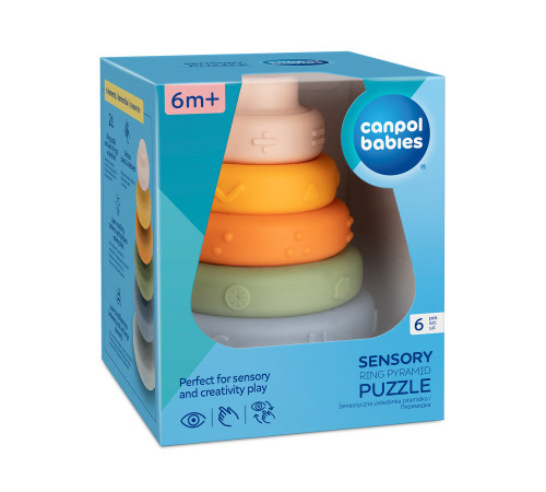 Пирамида-головоломка с сенсорными кольцами для малышей Canpol состоит из 6 элементов разного размера и цвета. Складывание красочных элементов от самых больших до самых маленьких в форме пирамиды тренирует ловкость и терпение ребенка. Сенсорная головоломка-пирамида помогает научиться различать цвета и размеры, поддерживает зрительно-моторную координацию ребенка. Каждый слой пирамидки имеет вставки различной формы – цифры, буквы, точки и т. д., чтобы малыш мог трогать их пальчиками, изучая новые фактуры, активизируя осязание или «дегустацию» – некоторые элементы будут великолепны как прорезыватели. Сенсорная кольцевая пирамида-головоломка – это классическая развивающая игрушка, благодаря которой ребенок в процессе игры развивает ручные навыки, память и воображение, а также логическое и стратегическое мышление – как построить башню из разбросанных элементов. Сборка пирамиды — увлекательное развлечение для малышей.