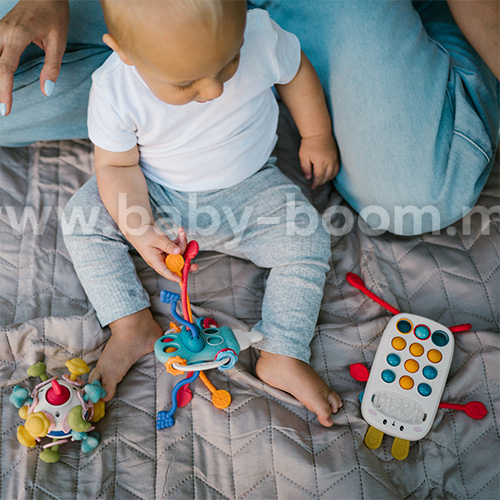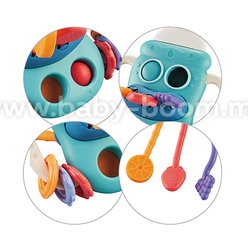 Игрушка состоит из различных элементов, изготовленных из безопасного силикона и прочного пластика. Ее можно сжимать, нажимать, тянуть и перемещать. Повышает привлекательность в глазах ребенка, а также побуждает к активным и творческим открытиям.