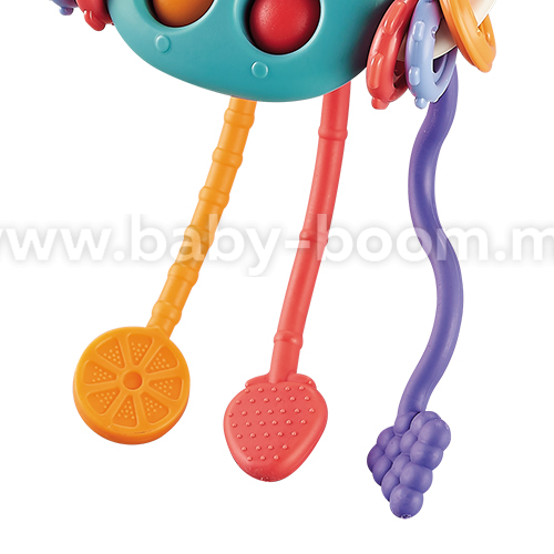 - МНОГОФУНКЦИОНАЛЬНОСТЬ Игрушка активно способствует сенсорному развитию ребенка. Оснащена элементами погремушки, интерактивными кнопками и силиконовыми шнурами с фруктами на концах.