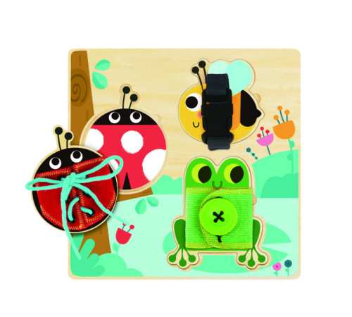 Бизиборд состоит из деревянной основы и 3 разноцветных пазлов - вкладышей с шнуровкой, пуговицей и защелкой.