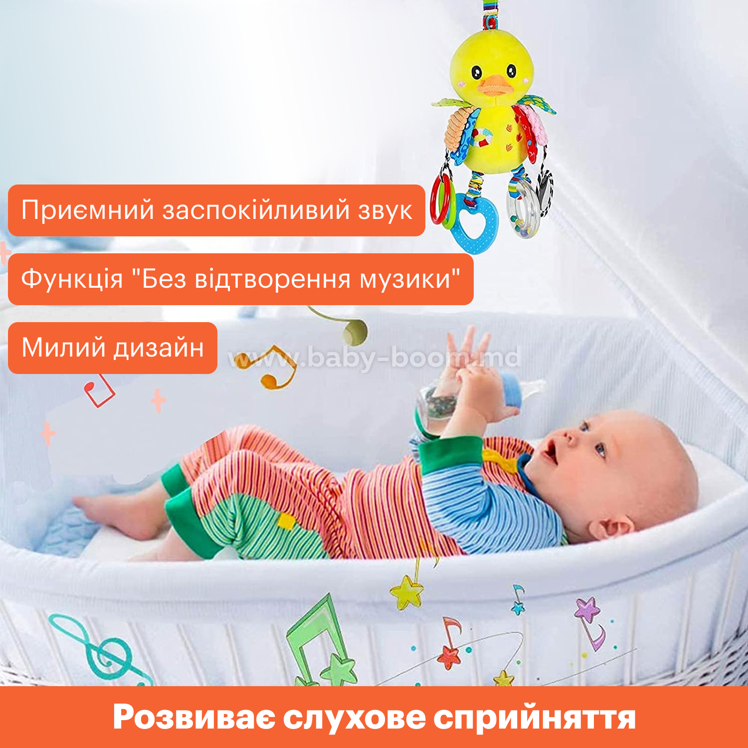 Игрушка-погремушка Hoogar "Уточка" с разнообразными развивающими элементами и кольцом для крепления на коляску или кроватку.