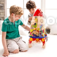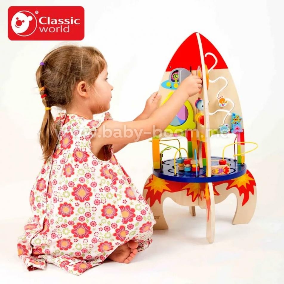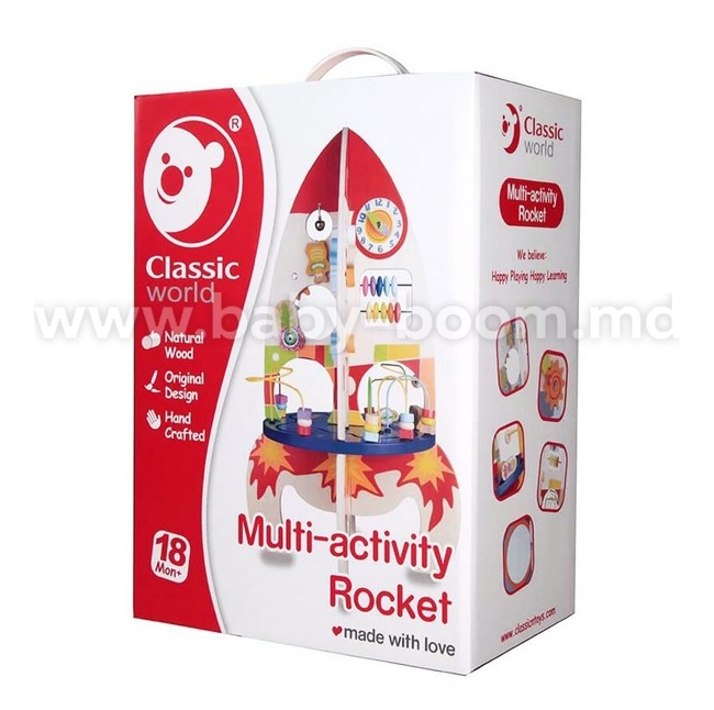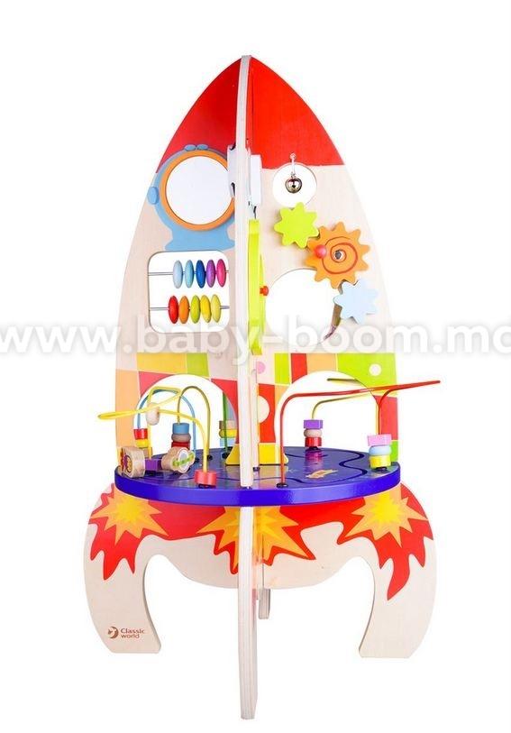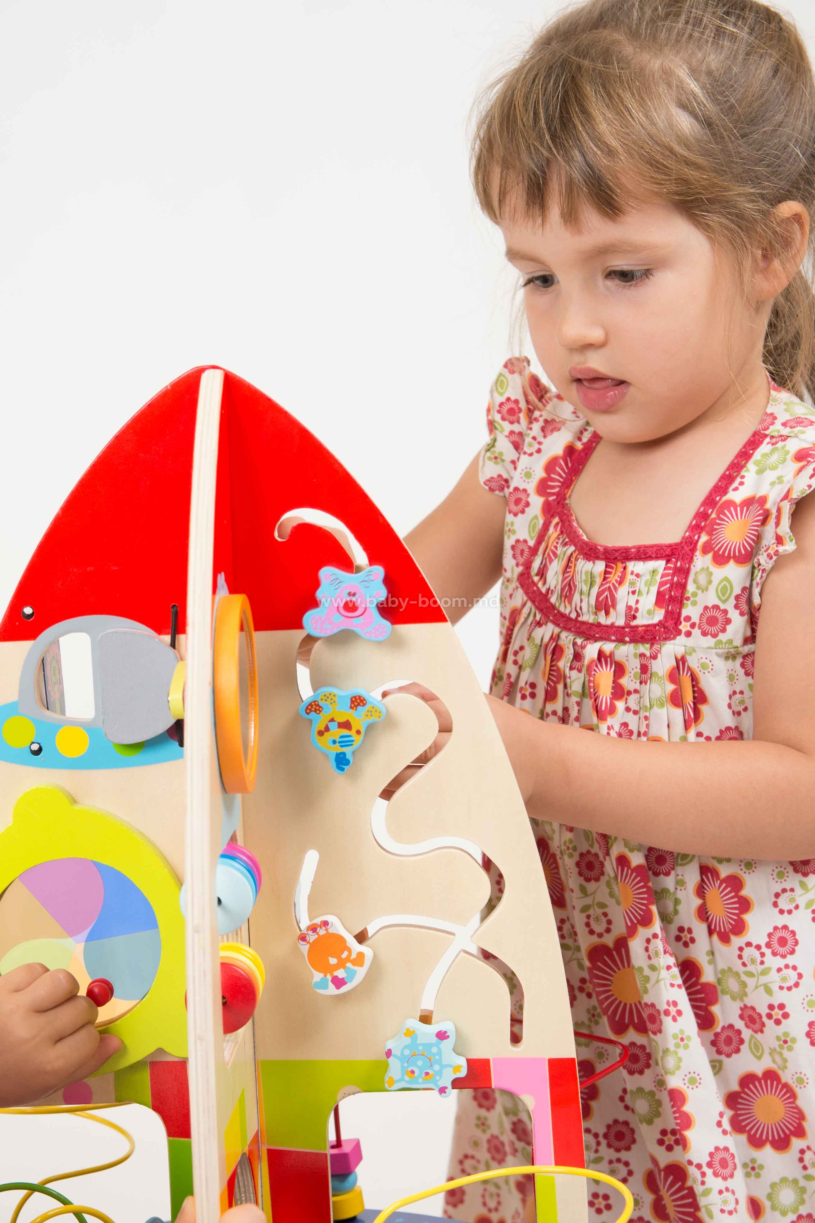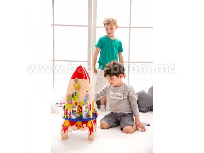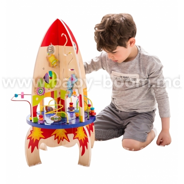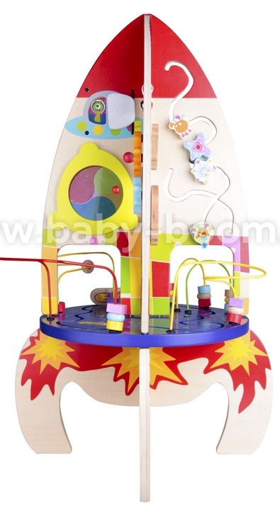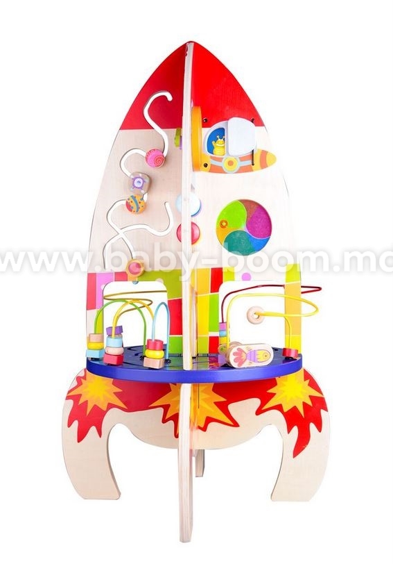 Ракета представляет собой многофункциональный развивающий центр, который включает в себя: увлекательный лабиринт, счеты, зеркальце, визуальные шестеренки, колокольчикИгрушка выполнена из натурального дерева, для её производства использованы безопасные для здоровья краски.