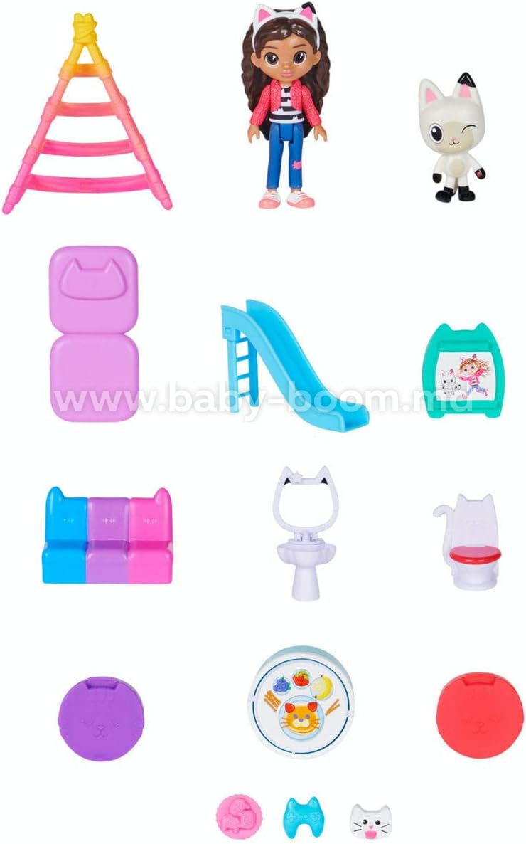 - 15 ИГРОВЫХ ЭЛЕМЕНТОВ - Весело играйте с Гэбби и ее лучшей подругой Панди Поус, 2 коробки с сюрпризами, 3 аксессуара и 15 элементов, включая 8 предметов мебели (диван, горка, складной стол, чтобы превратить его из завтрака в ужин) и многое другое