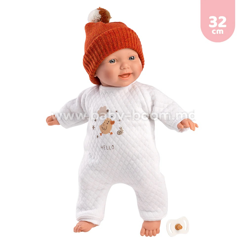 Наряд для малышки ростом 32 см, состоящий из белого комбинезона с принтом Hello и оранжевой шапочки.