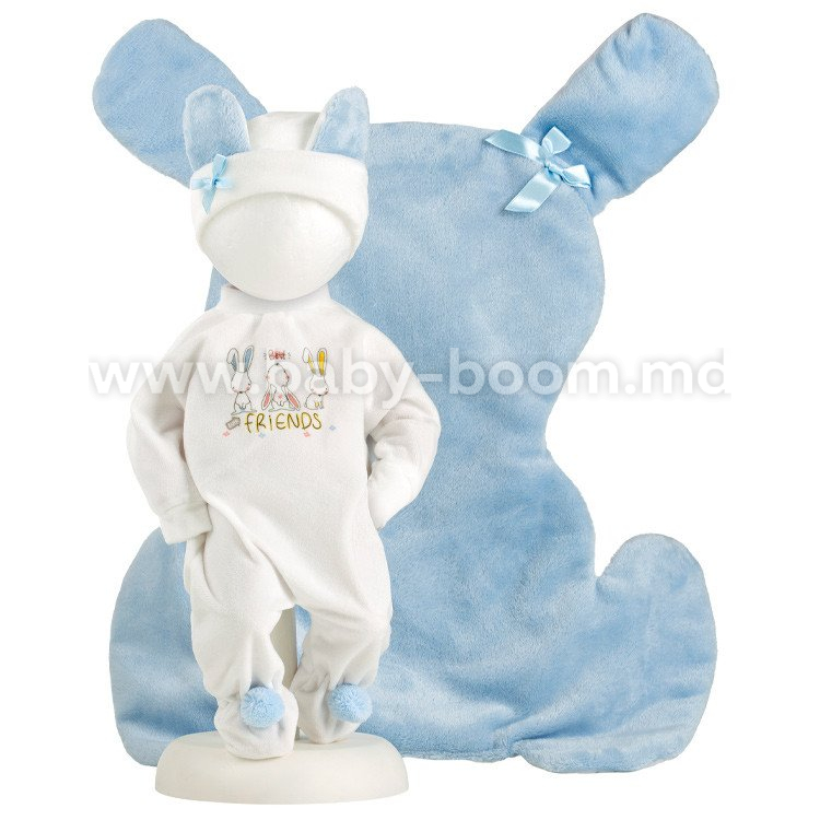 Наряд для новорожденной куклы ростом 35 см, состоящий из белого комбинезона с принтом «Лучший друг», шапочки с ушками и пеленальной подушечки в виде синего кролика.