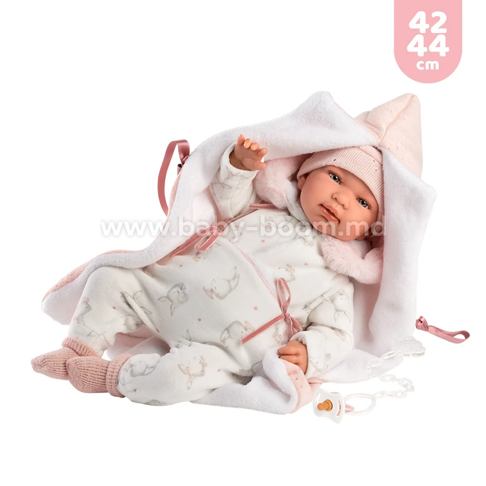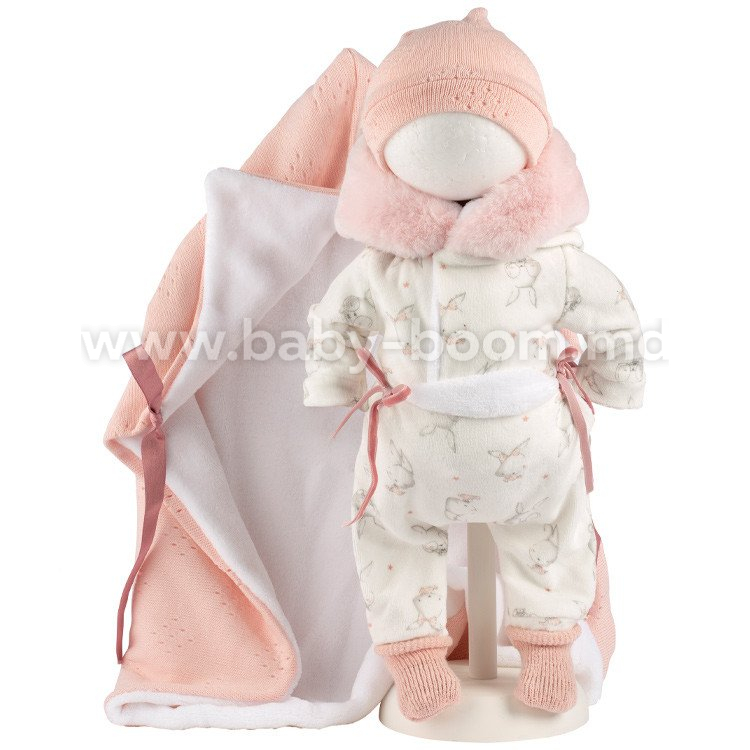 Комплект состоит из комбинезона с капюшоном, пинеток, розовой шапочки и розово-белого одеяльца. Для кукол ростом 42-44 см.