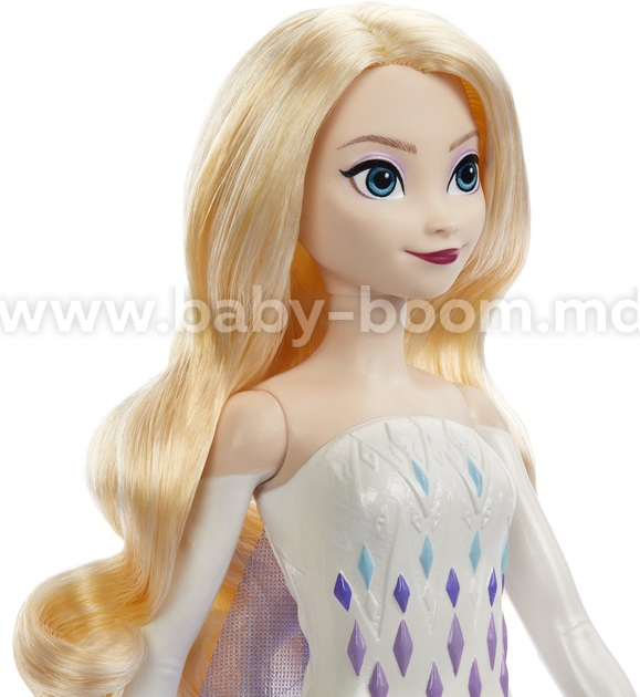 Кукла Эльза представлена в своем фантастическом образе Снежной Королевы, одетая в съемную мягкую юбку. Шлейф придает виду завершающих штрихов. В комплекте есть также четыре элемента для игры: ожерелье, обруч и расческа для укладки длинных волос Эльзы, а также друг-снежок.