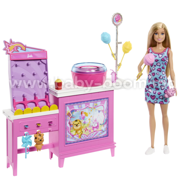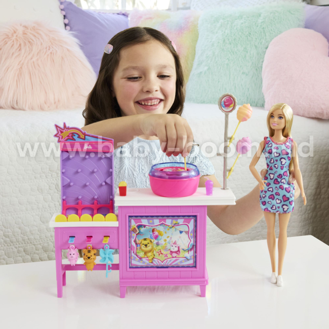 Здесь есть все для яркой игры – более 15 аксессуаров, включая игровой автомат с призами и машиной для приготовления сахарной ваты.