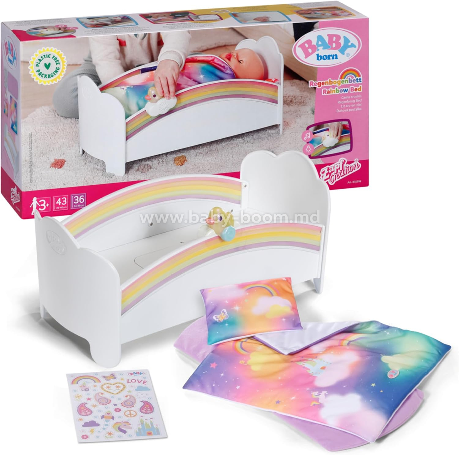 - Радужная кроватка BABY born с радужными огнями и успокаивающей колыбельной.
