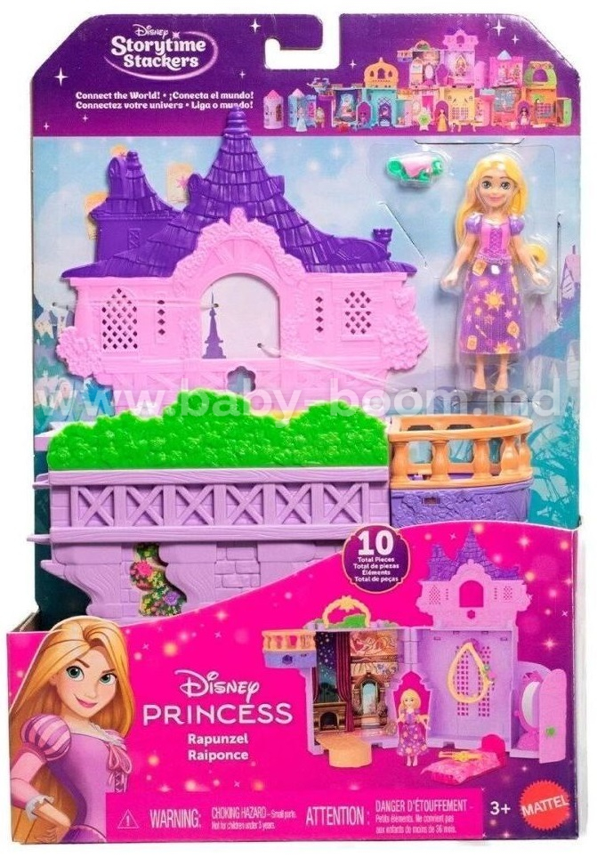 Башня легко открывается, оснащена ручкой для удобной переноски и совместима с другими игровыми наборами серии Disney Storytime Stackers.
