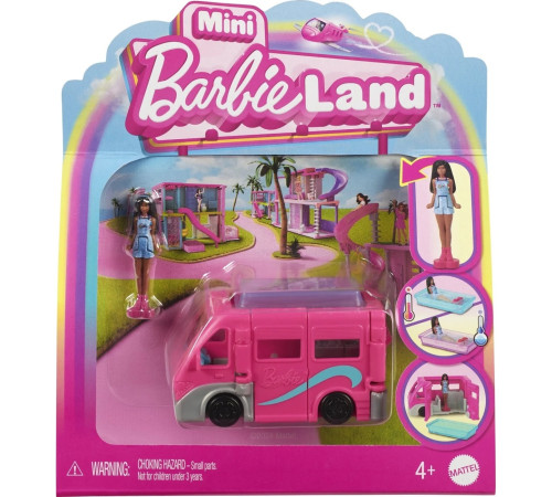 В каждый набор входит очаровательно стилизованная 4 см. кукла Барби, которая сгибается в талии, чтобы она могла сидеть и ехать навстречу большим приключениям в Mini BarbieLand.