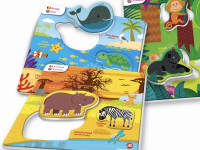 Игра содержит 6 больших досок с местами обитания животных и 18 деталей-пазлов с мелкими животными.