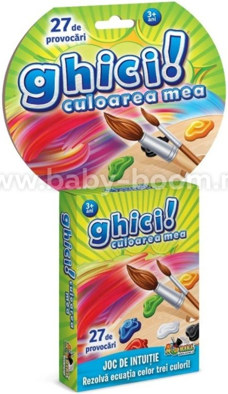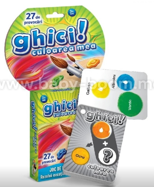 "Угадай мой цвет!" состоит из 27 иллюстрированных карточек (7,2 x 10 см), прикрепленных друг к другу и покрытых перфорированной карточкой, которая частично скрывает иллюстрации, оставляя видимыми две важные подсказки.