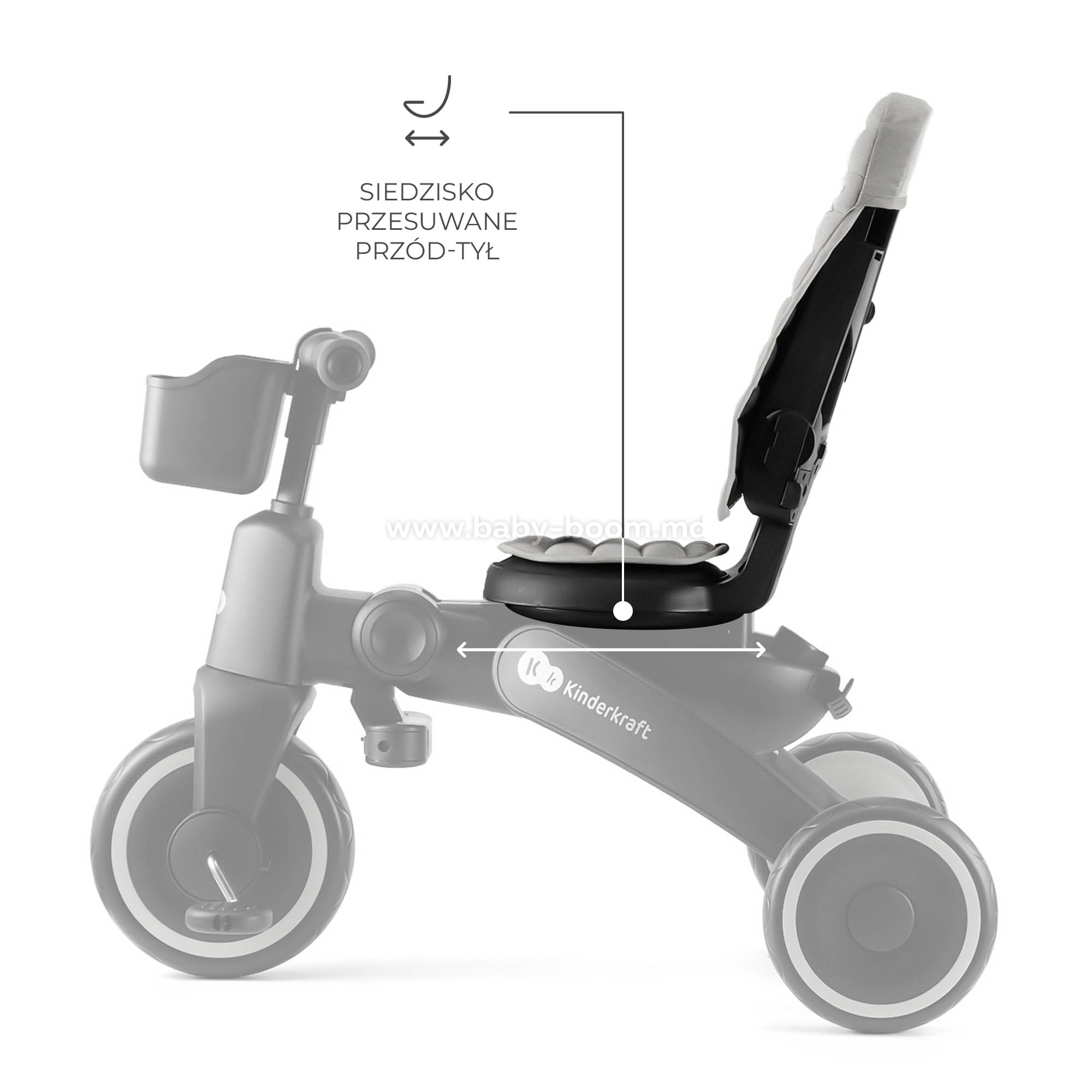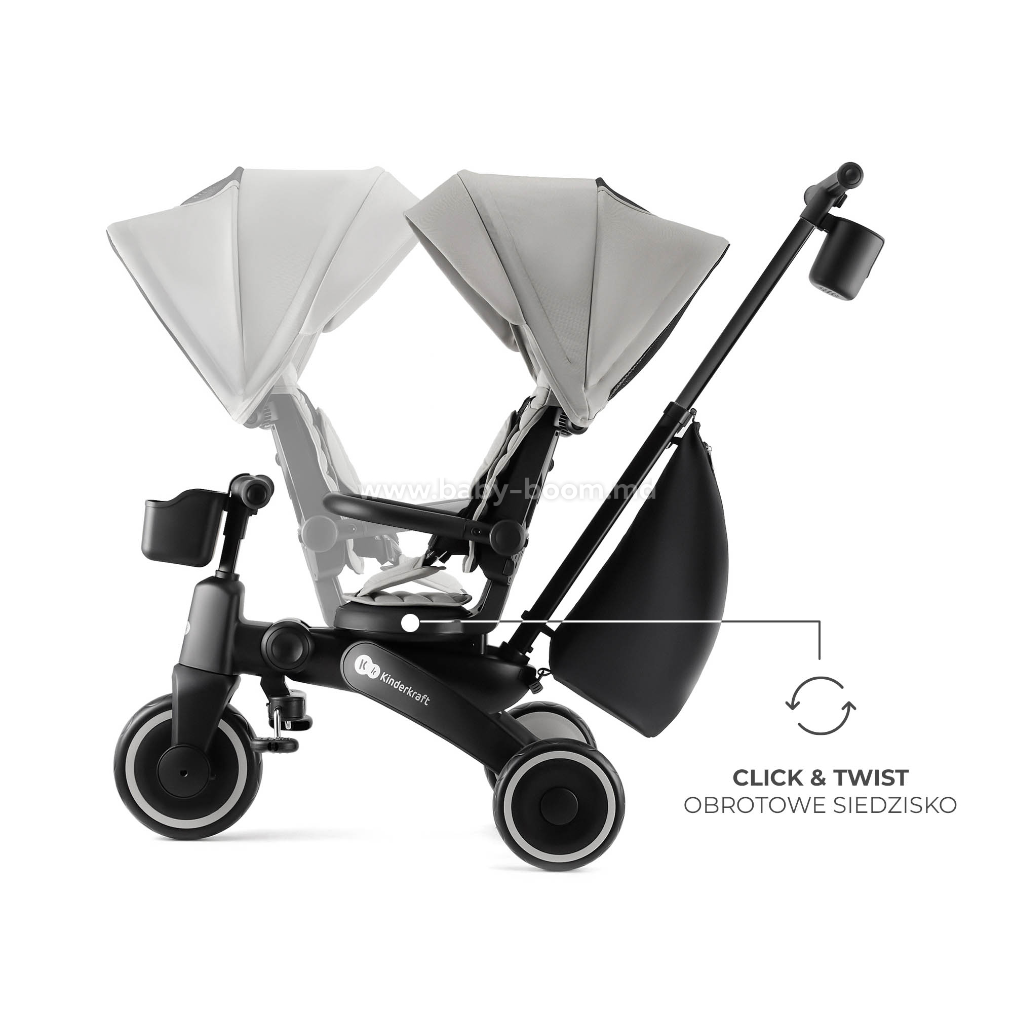 - Вращающееся сиденье CLICK&TWIST – гибкость и комфорт. Сиденье с функцией вращения на 360° позволяет размещать ребенка лицом вперед или назад. Такое решение дает малышу чувство безопасности, позволяя ему поддерживать зрительный контакт с родителем или наблюдать за окружающей обстановкой. Кроме того, вы можете отрегулировать сиденье в обоих положениях, подгоняя велосипед под рост ребенка и обеспечивая тем самым больший комфорт.