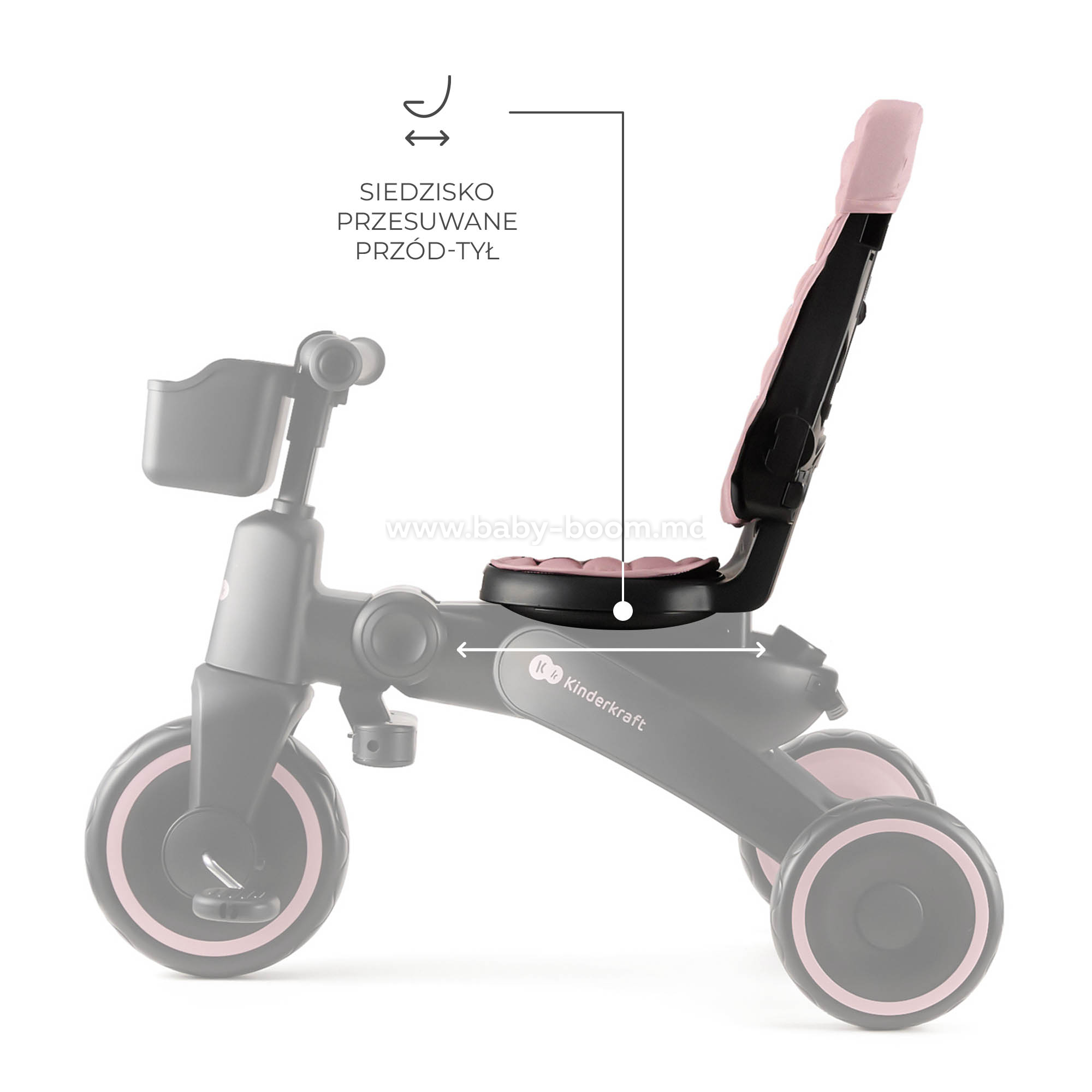 - Вращающееся сиденье CLICK&TWIST – гибкость и комфорт. Сиденье с функцией вращения на 360° позволяет размещать ребенка лицом вперед или назад. Такое решение дает малышу чувство безопасности, позволяя ему поддерживать зрительный контакт с родителем или наблюдать за окружающей обстановкой. Кроме того, вы можете отрегулировать сиденье в обоих положениях, подгоняя велосипед под рост ребенка и обеспечивая тем самым больший комфорт.