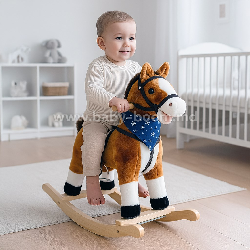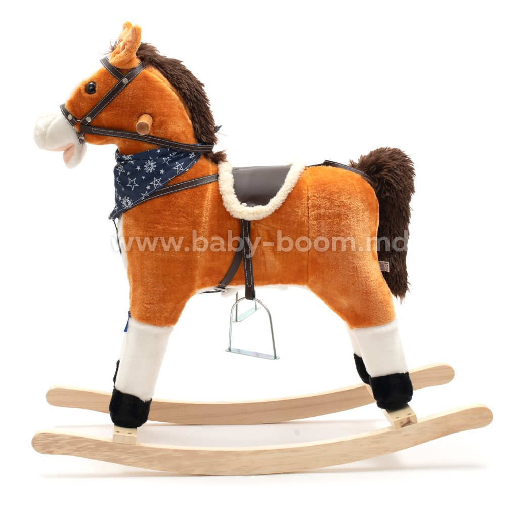 Мягкая лошадка-качалка Baby Mix создана для детей, любящих приключения. Она выглядит как настоящая, поэтому ваш ребенок почувствует себя настоящим наездником. Лошадка изготовлена из мягкого плюша, украшена декоративным шарфом на шее и оснащена деревянными перекладинами, профиль которых защищает вашего ребенка от опрокидывания. Удобное седло, прочная уздечка, металлические стремена, деревянные ручки и устойчивые перекладины обеспечат вашему ковбою еще большую устойчивость и комфорт во время качания. Прочные деревянные перекладины или ручки изготовлены из мягкого плюша и легко откручиваются. При нажатии на кнопки на ушах лошадка виляет хвостом, двигает лапой, слышится звук галопа, лошадка ржет и поет ковбойскую песню. Три необходимые батарейки типа АА 1,5 В вставляются в футляр, расположенный на животе лошадки (в комплект не входят). Во время качания ребенок учится координировать движения своего тела с движениями лошадки, что улучшает общее равновесие и моторику ребенка.
